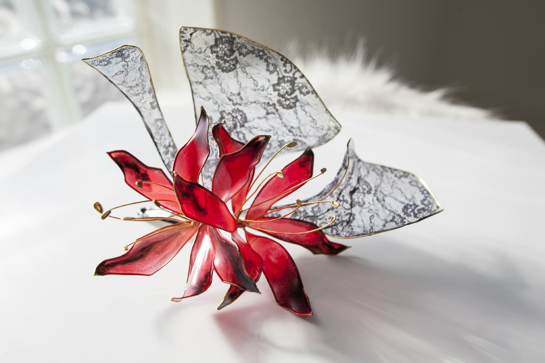 死人花。ヘッドドレスに似合う彼岸花をご用意しました。喪に服すときの礼装であるトークハットの、黒い目隠しベールをあしらっています。こちらはカンザシではなく、パッチンのスリーブピン仕様。イヤーカフもあります。