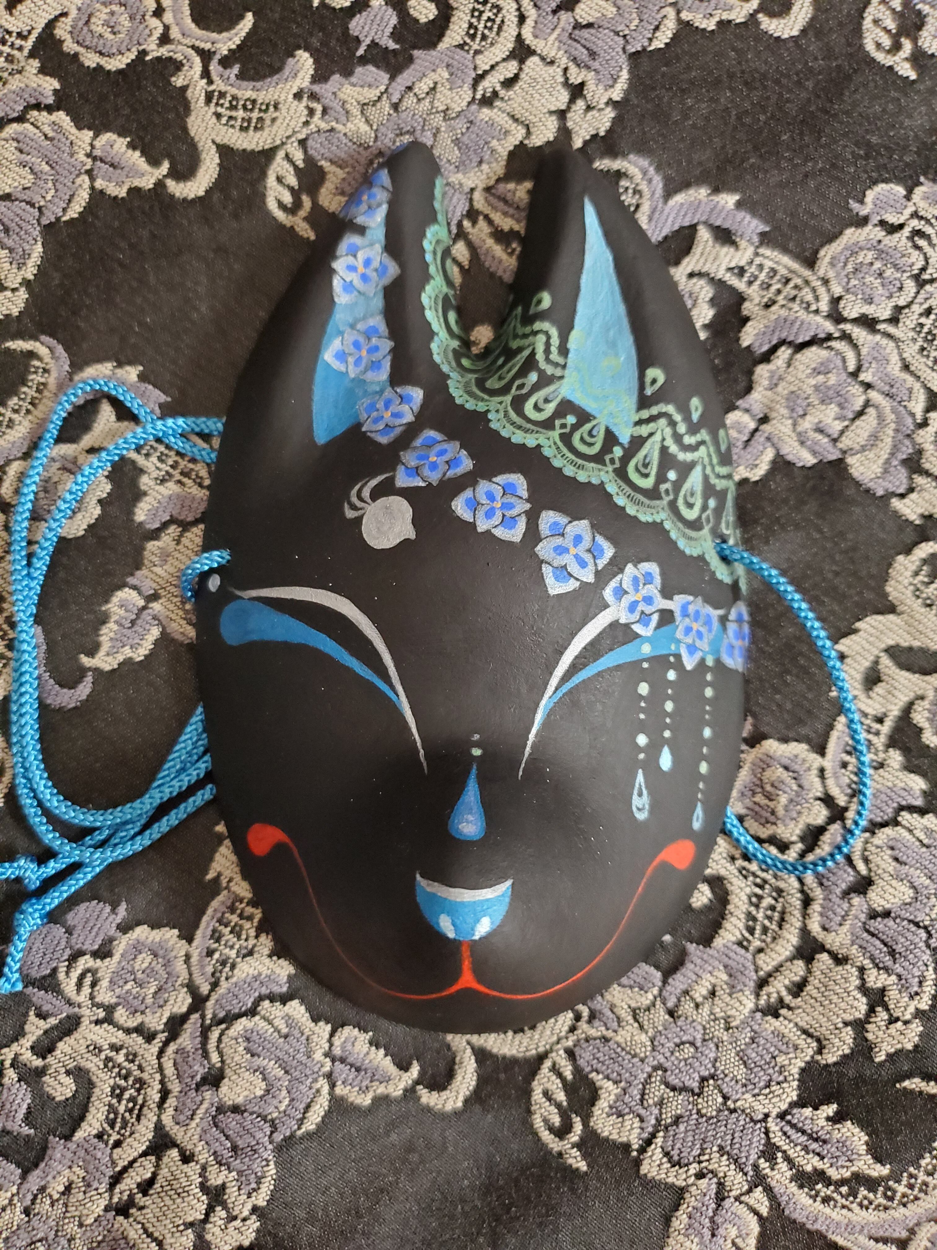 狐面に紫陽花モチーフのミニ張り子面です。