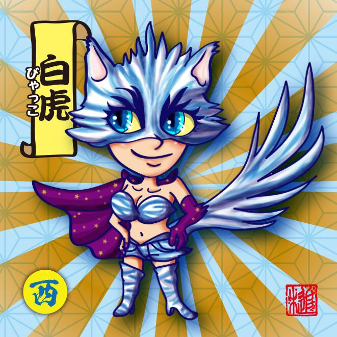 細長い体をした白い虎の形をしている。また、四神の中では最も高齢の存在であるとも言われている。(逆に、最も若いという説もある)