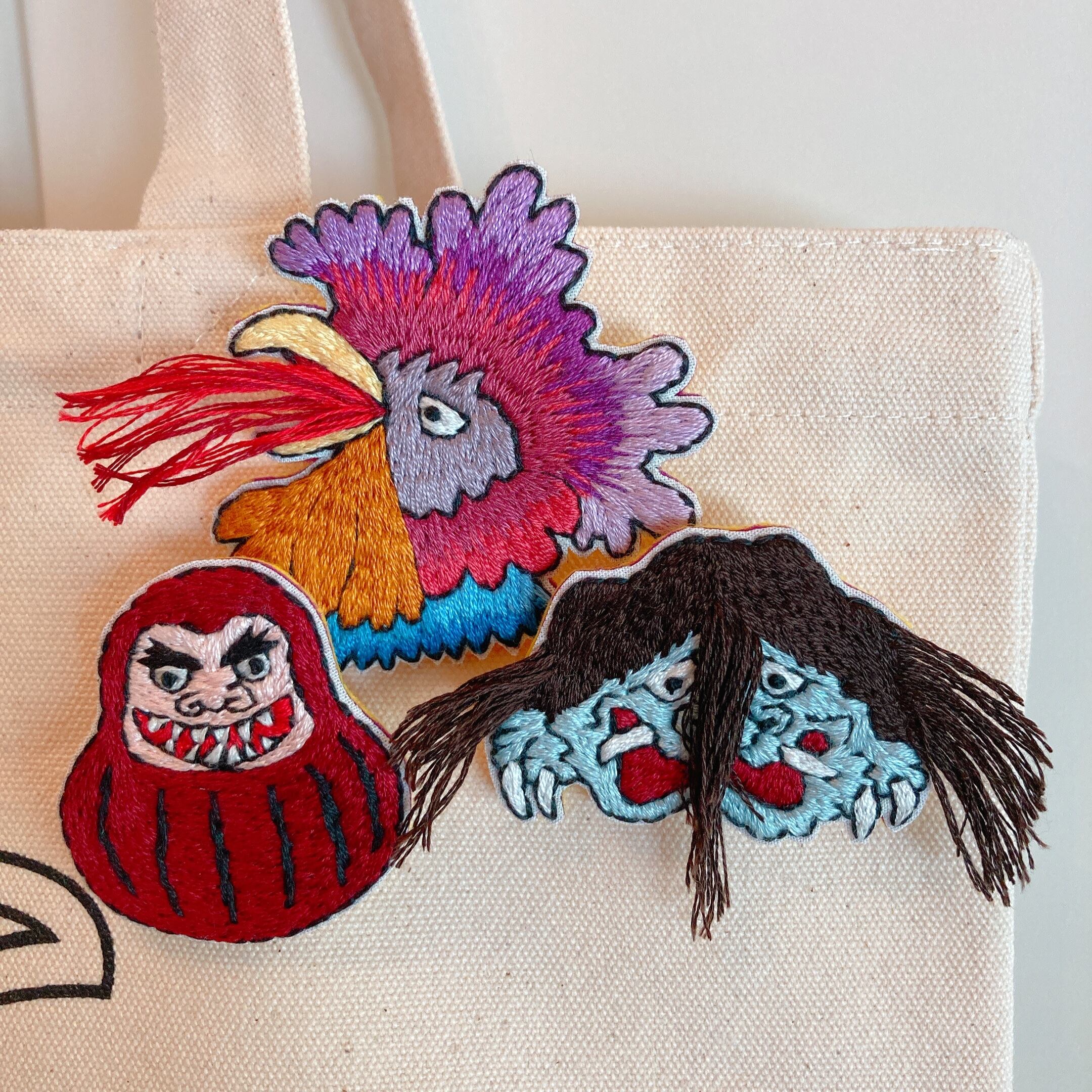 手刺繍の妖怪ブローチです!手刺繍ならではのモコモコ感が妖怪が浮き出たような迫力あるよ!