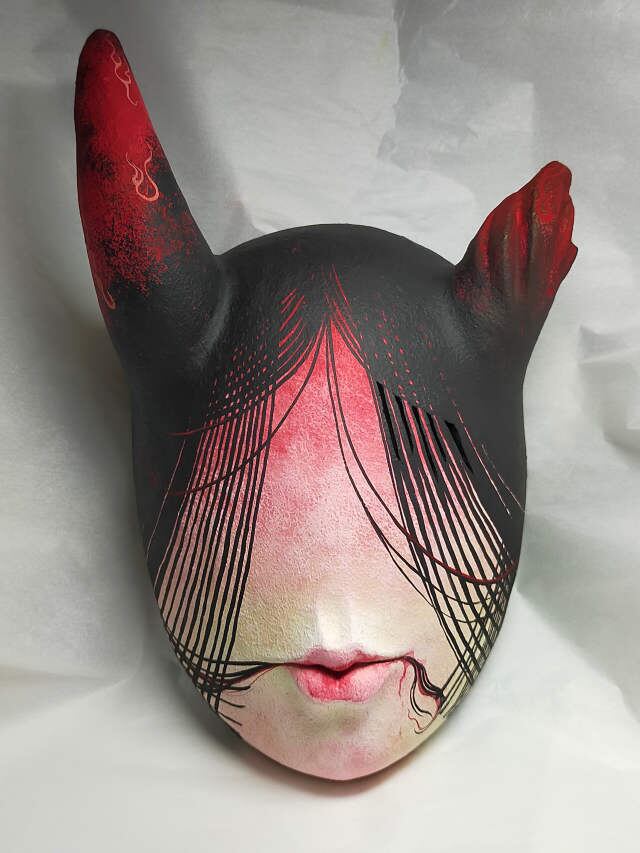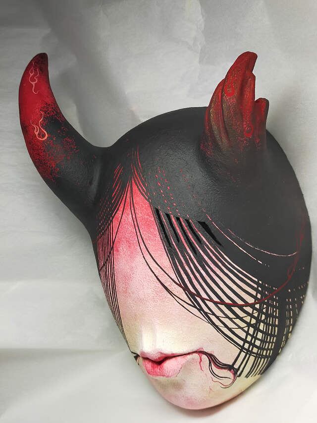 唯一無二の面を作り続けるまいけるからわたの張り子面 【恋鬼】。