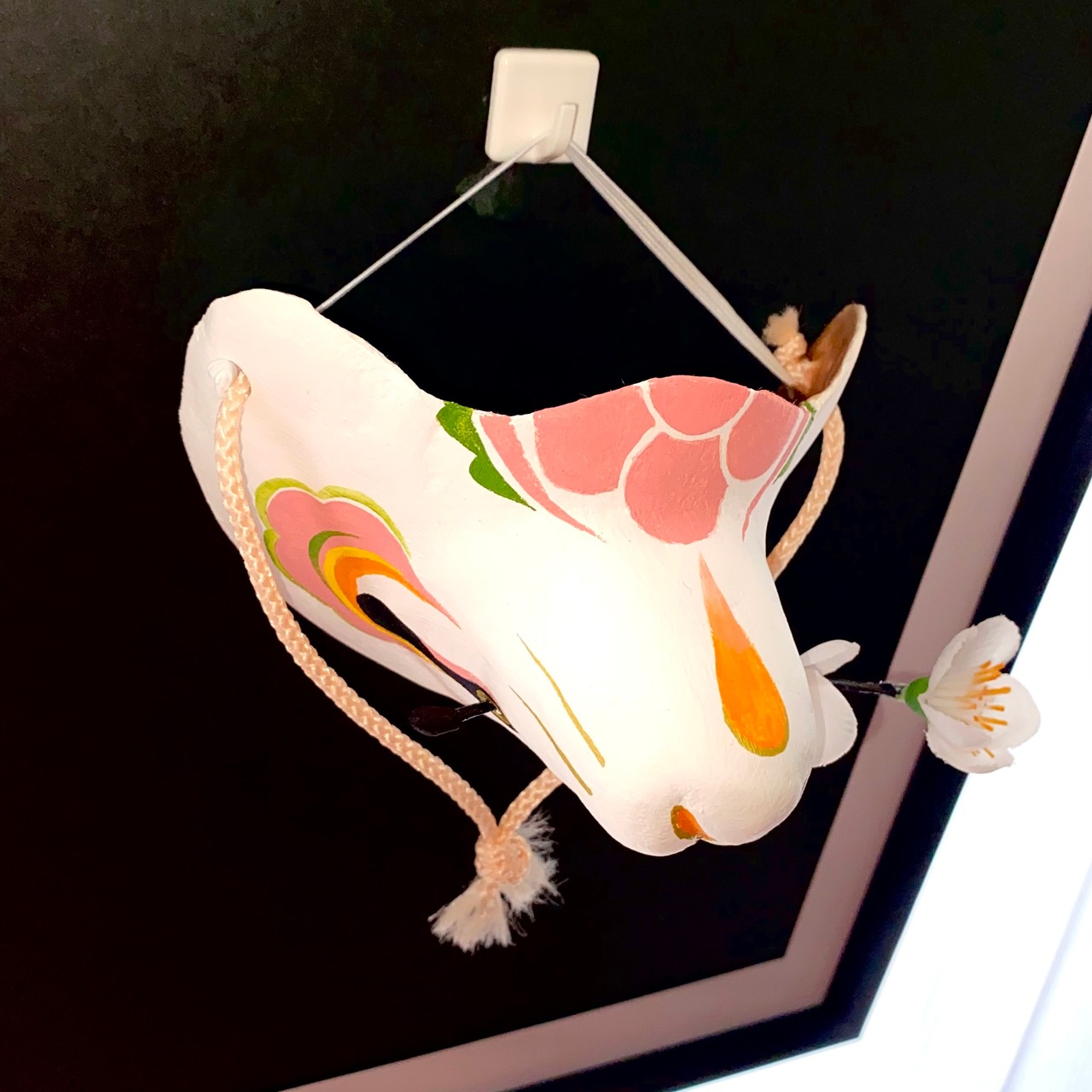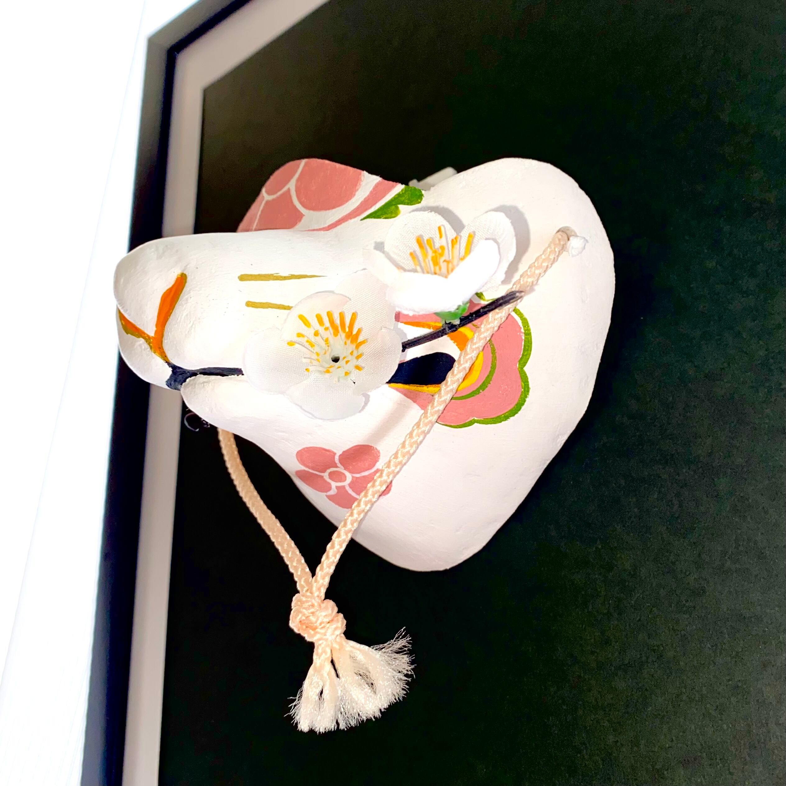 白昼の可愛らしい梅を模した、梅の木を咥えた狐面です。
