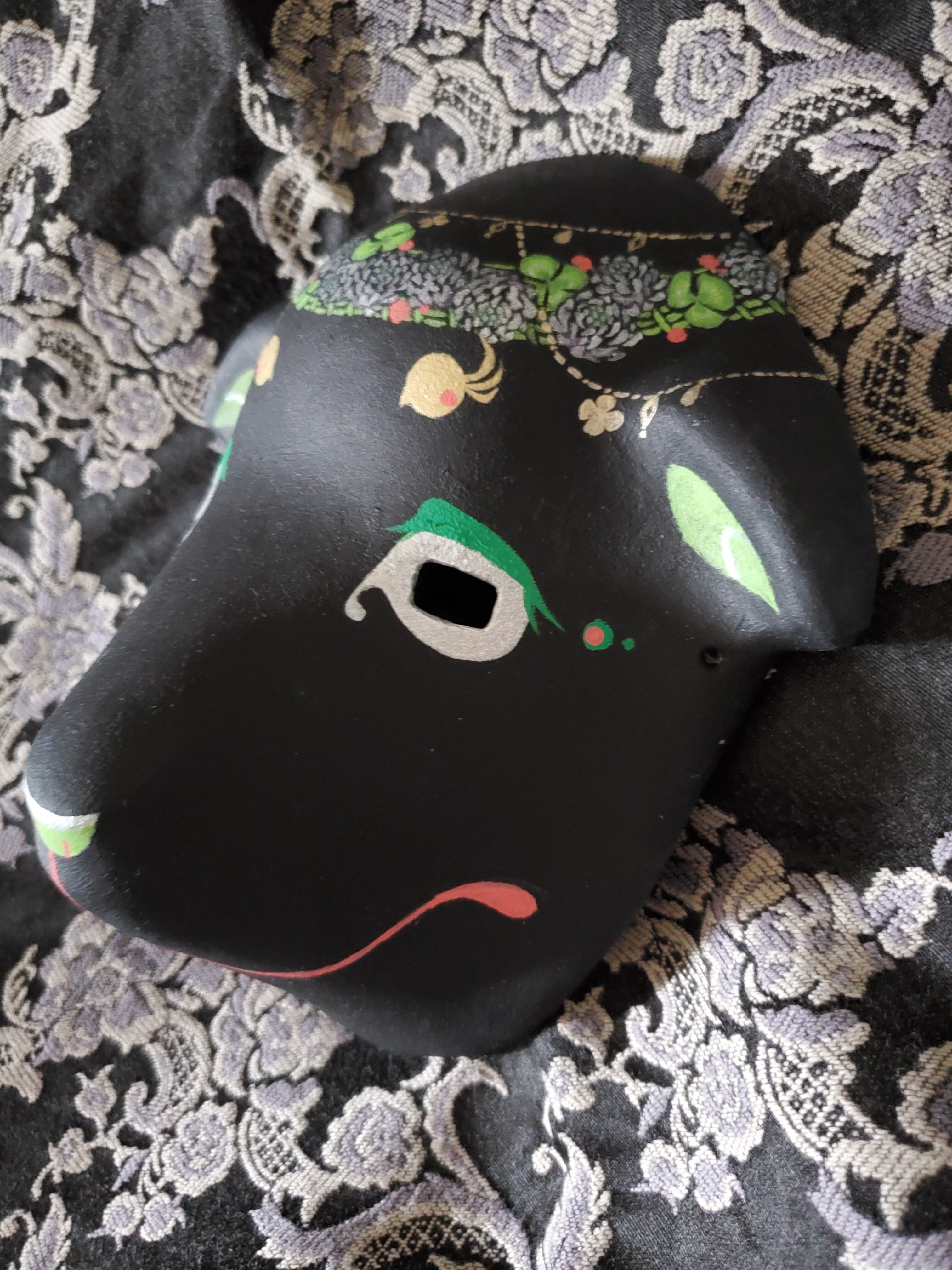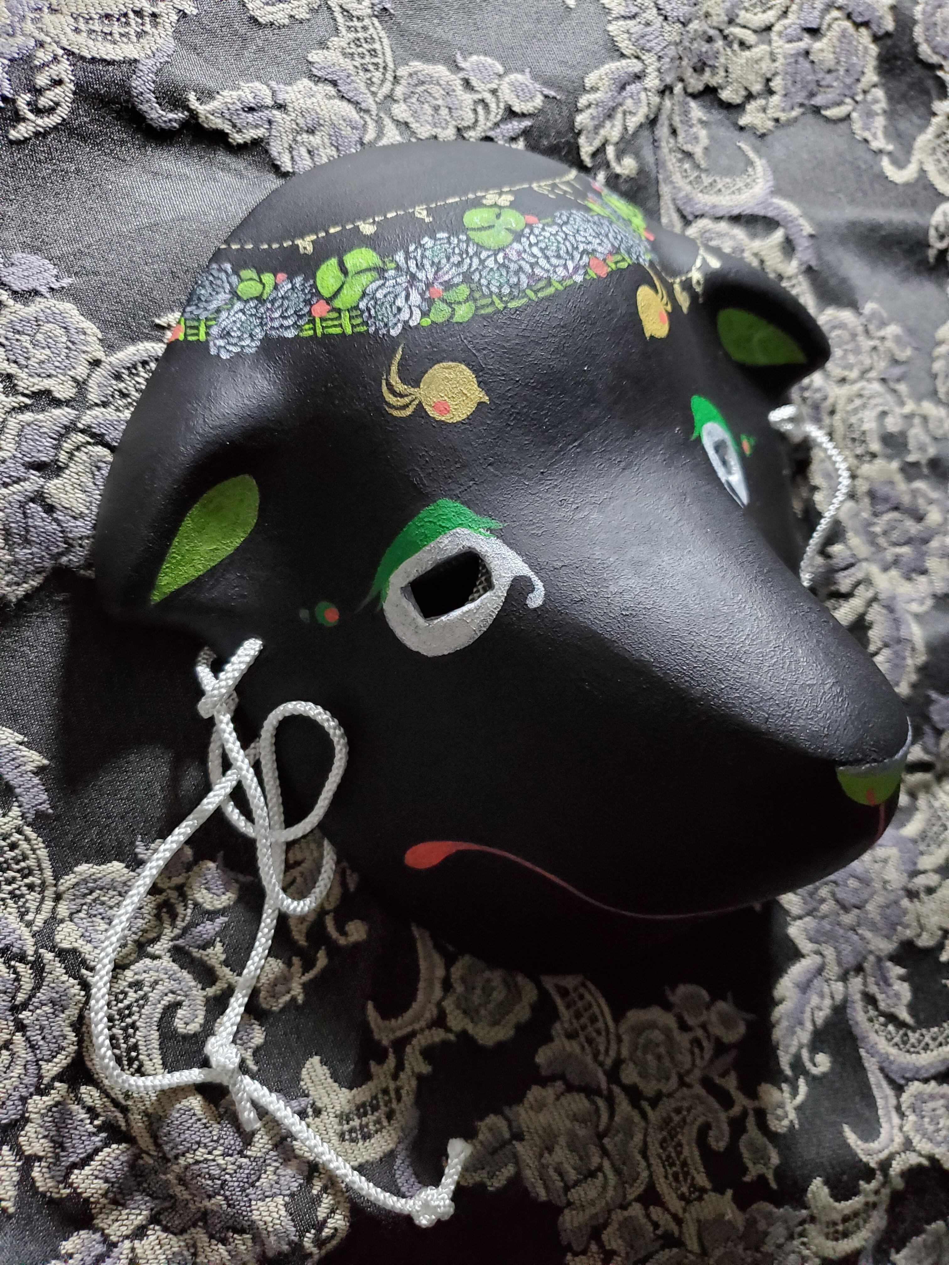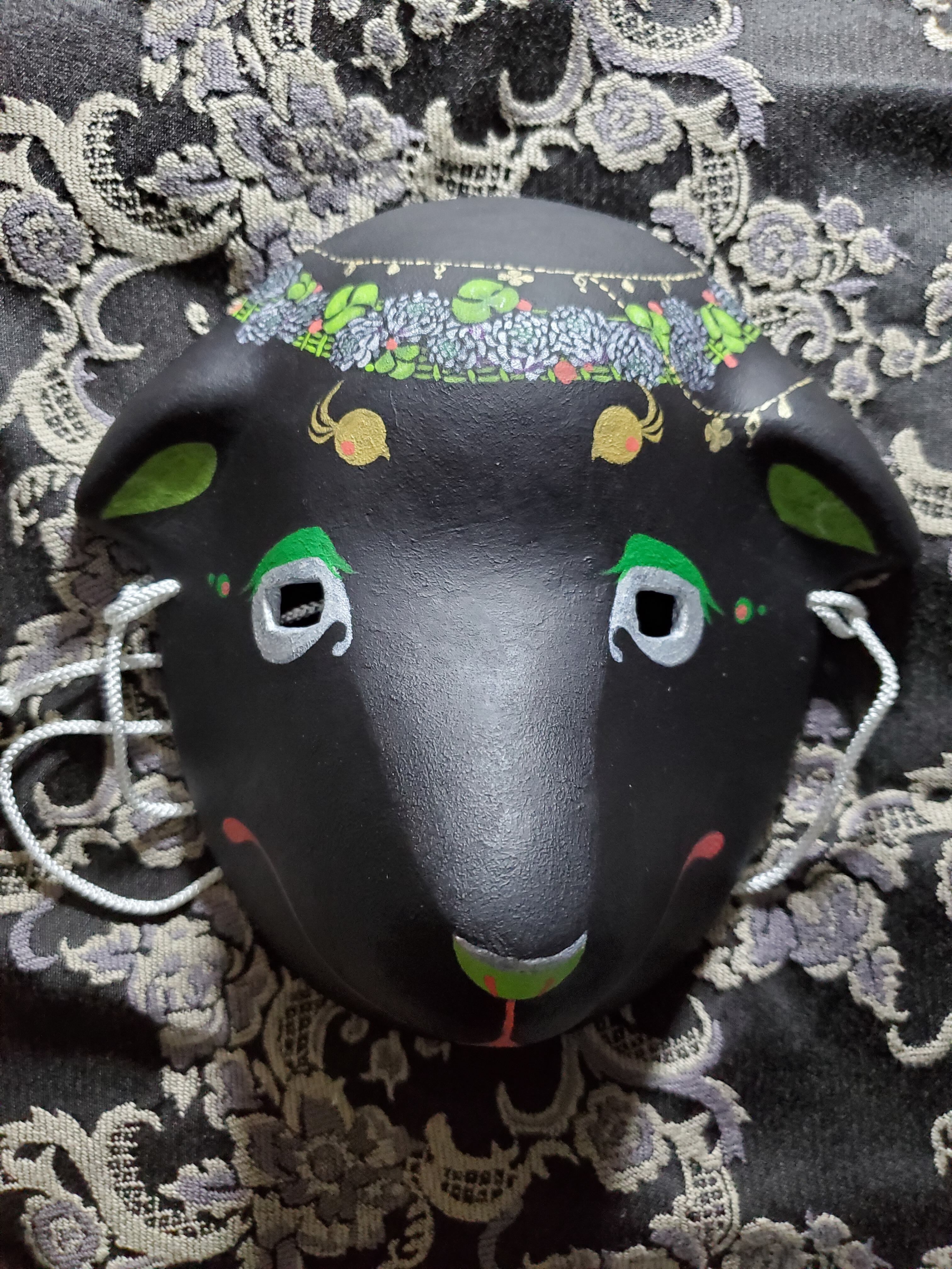 ばろめっつ面に白詰草モチーフの張り子面です。